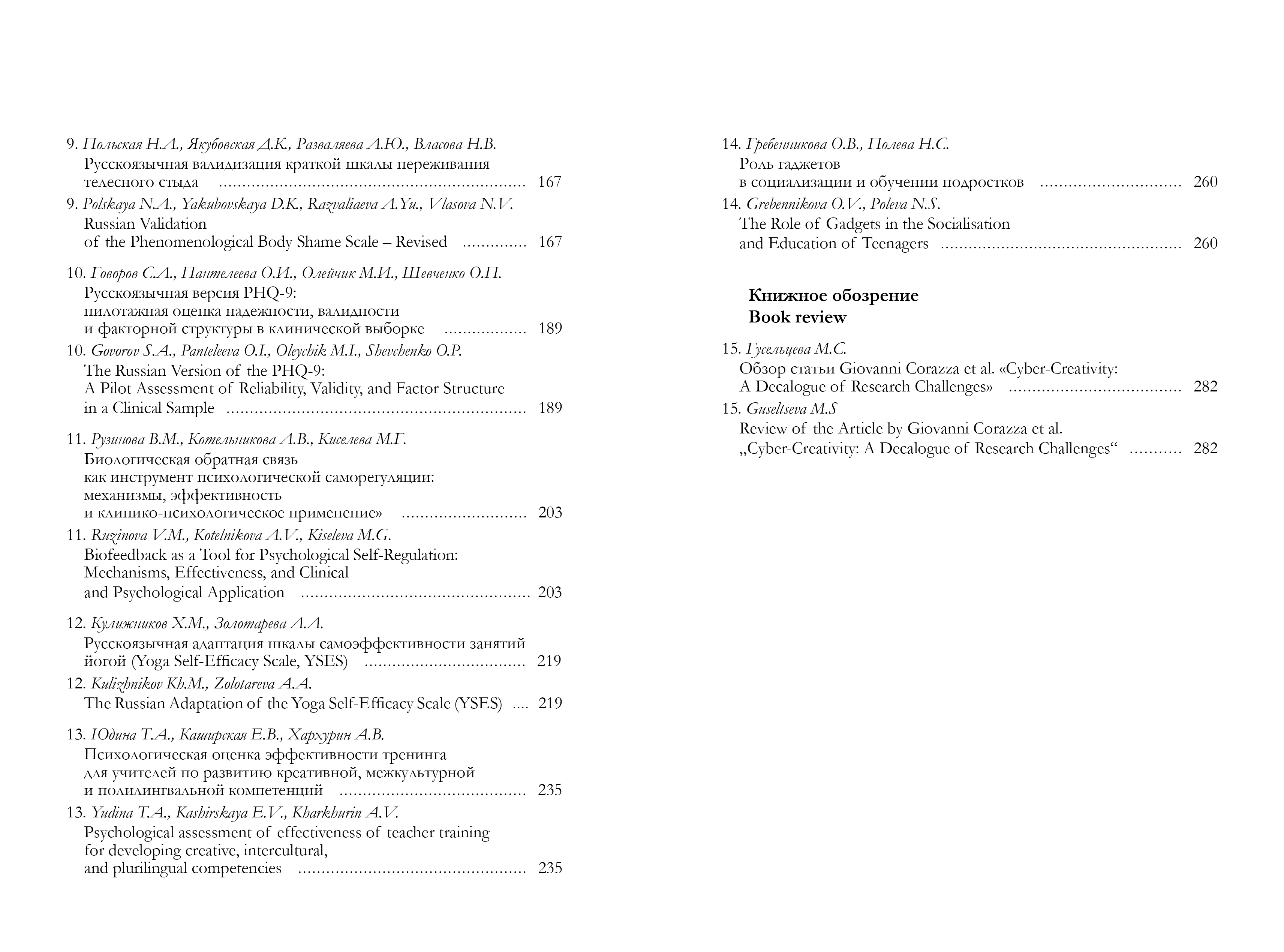 The article by T.A. Yudina, E.V. Kashirskaya, and A.V. Kharkhurin "Psychological assessment of the effectiveness of a teacher training for developing students' creative, intercultural, and multilingual competencies" describes a program for psychologically assessing the effectiveness of a teacher training program. This program uses a pre-test/post-test experimental design, incorporating both quantitative and qualitative instruments for measuring competencies in both teachers and students. It promotes the development of a creative self and pedagogical self-efficacy and supports the subjective well-being of school teachers.