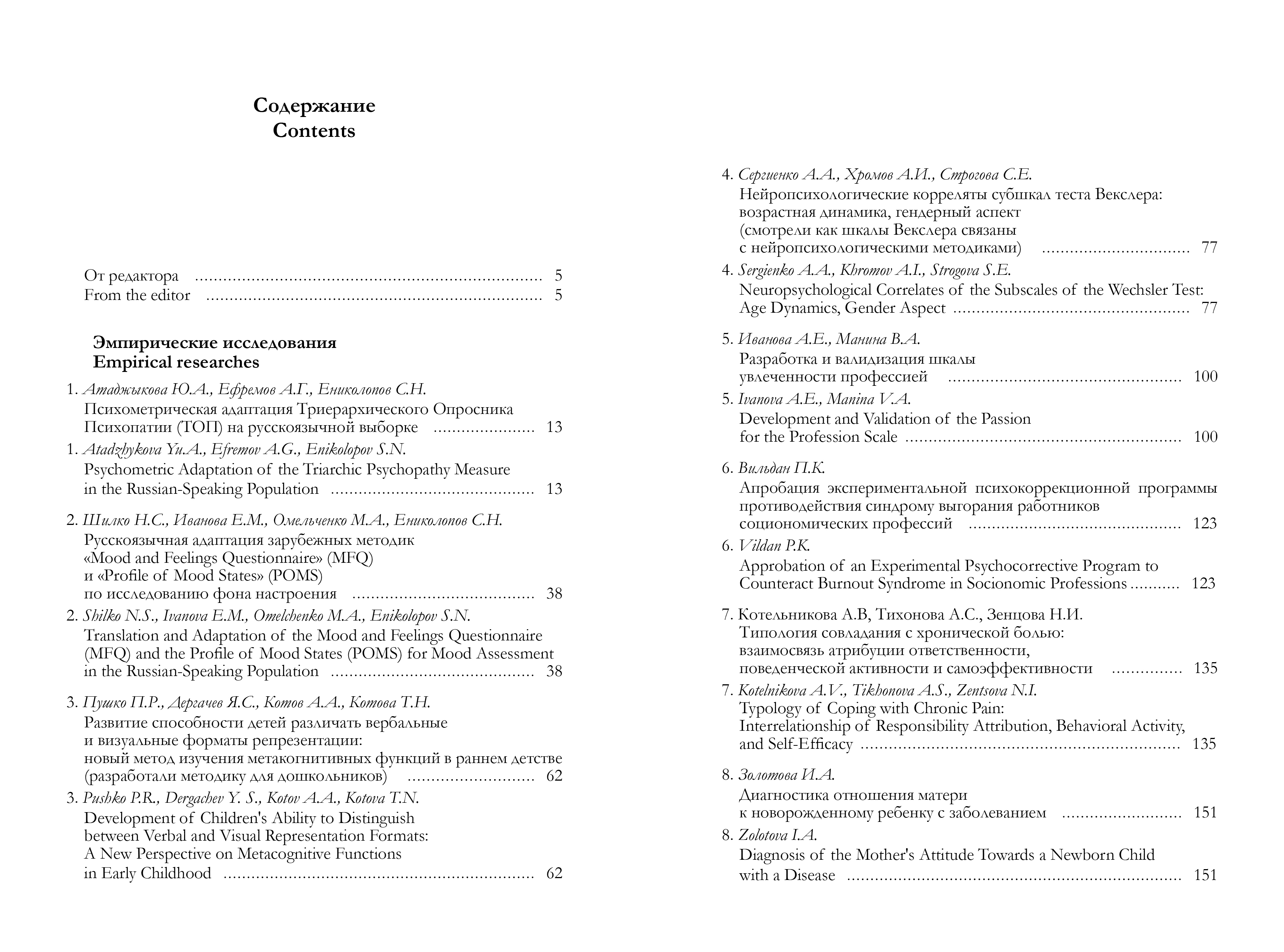 Открывает номер статья Ю.А. Атаджыковой, А.Г. Ефремов и С.Н. Ениколопова «Психометрическая адаптация Триерархического Опросника Психопатии (ТОП) на русскоязычной выборке». В статье подчеркивается, что в русскоязычном психологическом пространстве на настоящий момент отсутствуют инструменты измерения психопатии. Триерархическая модель психопатии позволяет изучать психопатию как дименсиальный конструкт, а разработанный на ее основе Триерахический опросник психопатии (ТОП) демонстрирует высокий потенциал для исследования психопатии в теоретических и практических целях, оставаясь компактным и недорогим инструментом. Авторы подчеркивают, что ТОП в полной русскоязычной версии является удовлетворительной методикой измерения психопатии.