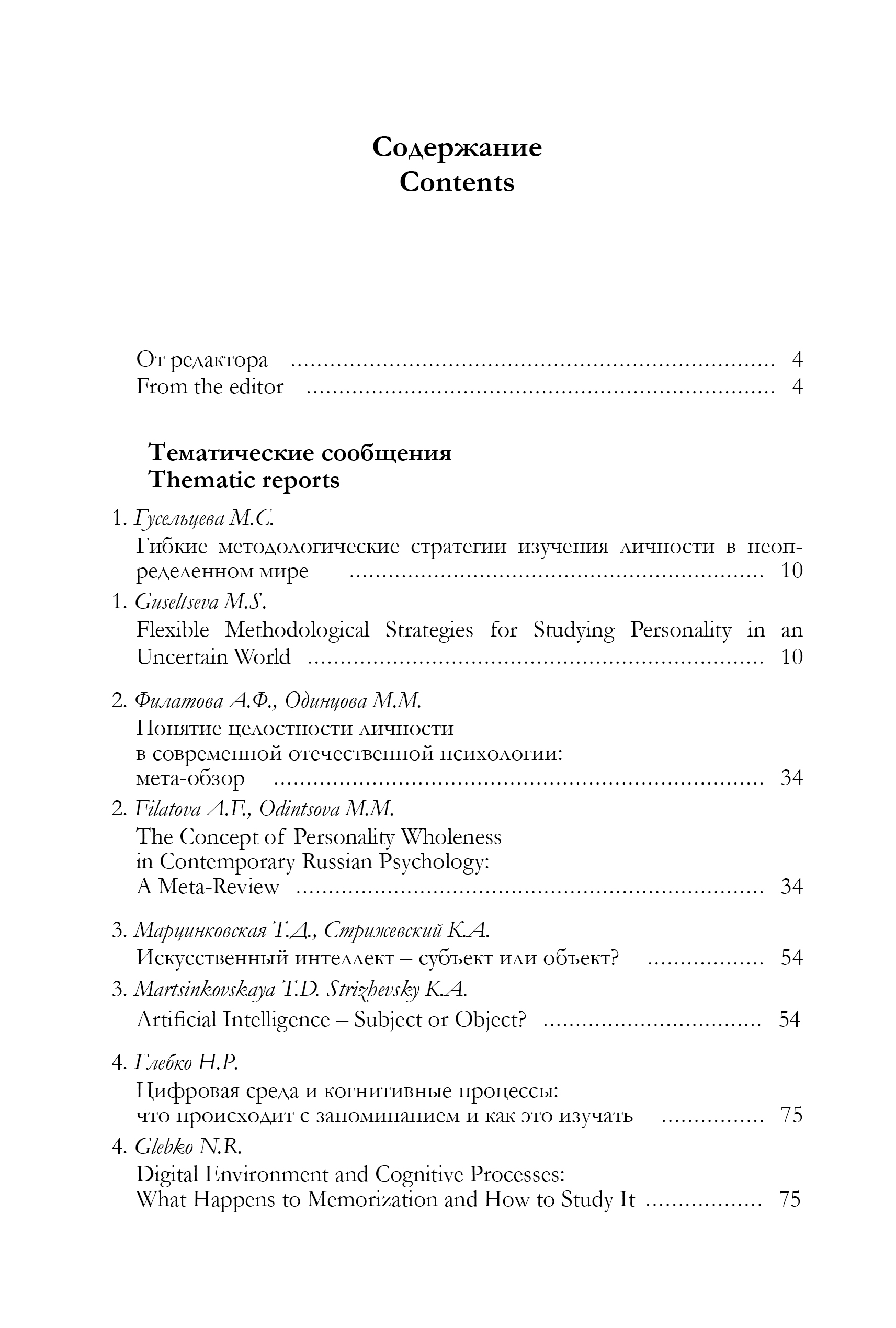 В журнале представлены исследования, затрагивающие различные аспекты современной психологии. Но можно выделить и ведущую тему данного номера, связанную с одной из самых актуальных проблем – психологией искусственного интеллекта.